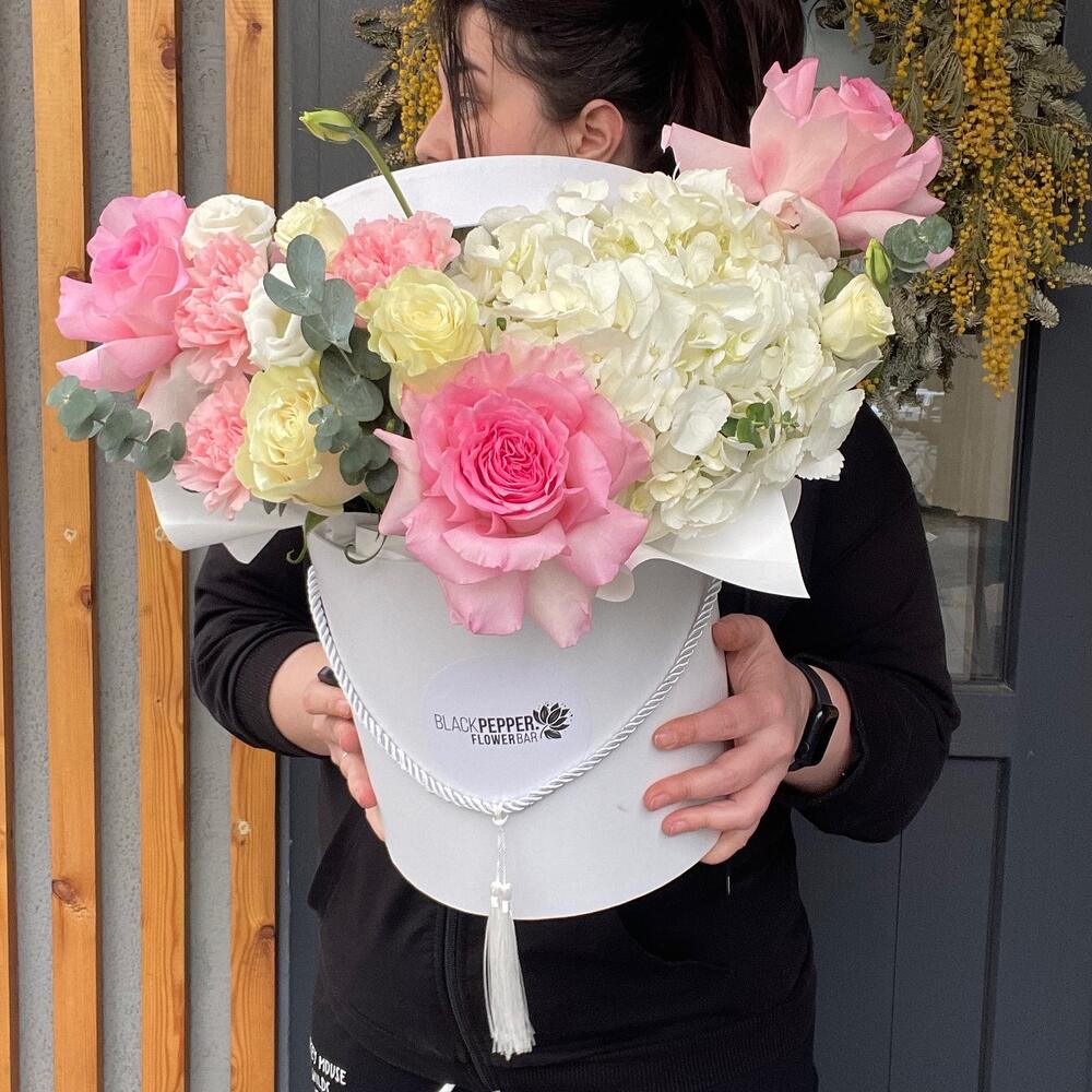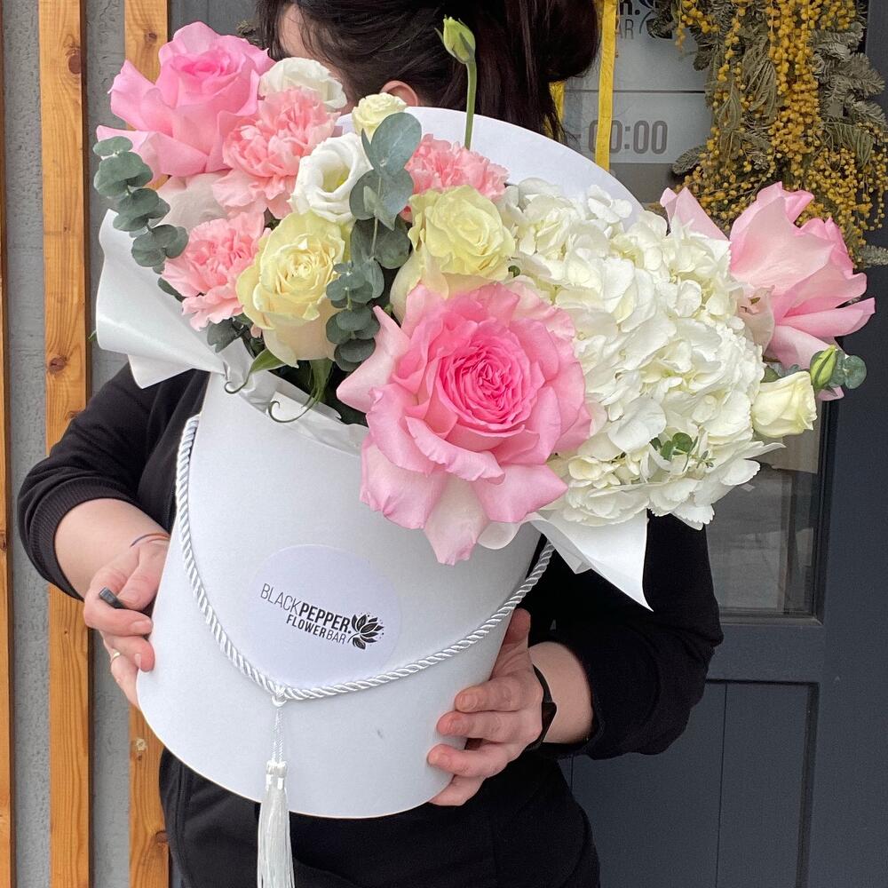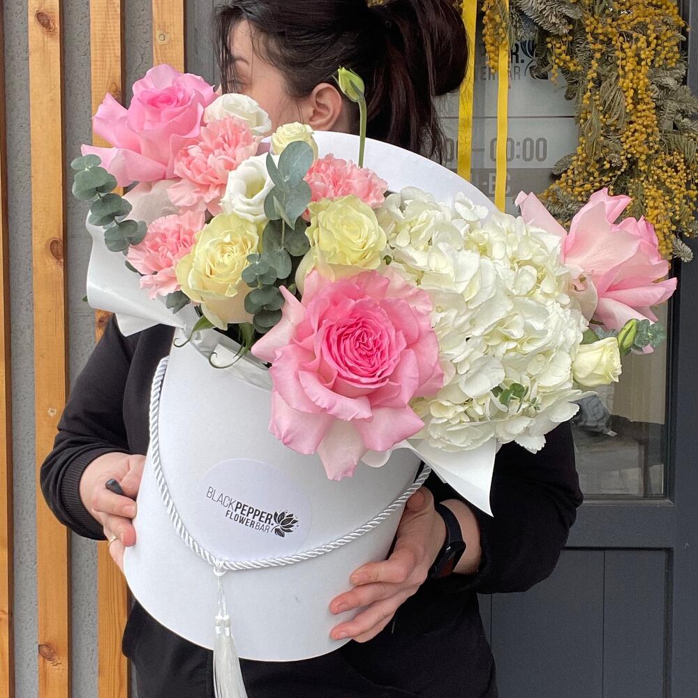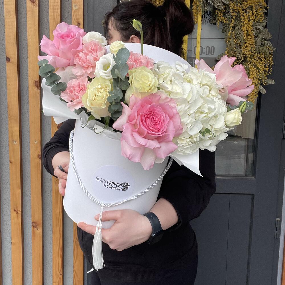 Гортензия - 1 шт. Роза - 5 шт. Эустома - 2 шт. Диантус - 3 шт.