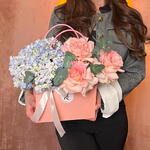 Гортензия - 1 шт. Французская роза - 3 шт. Сумочка - 1 шт. Эвкалипт Микс - 1 шт. Оазис флористический - 1 шт.