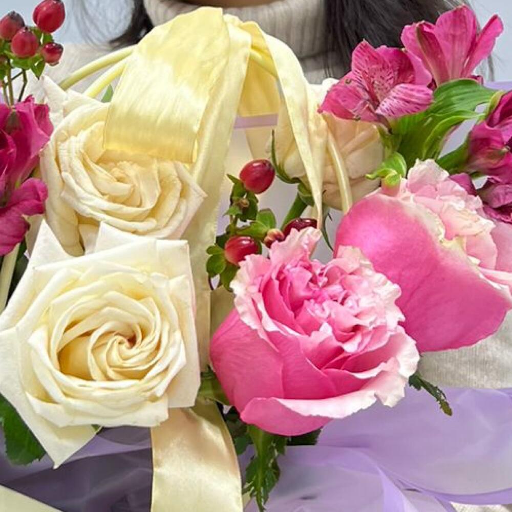 Альстромерия - 3 шт. Гиперикум - 3 шт. Роза - 7 шт.