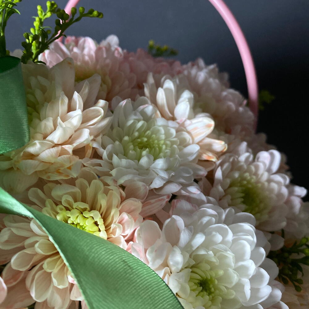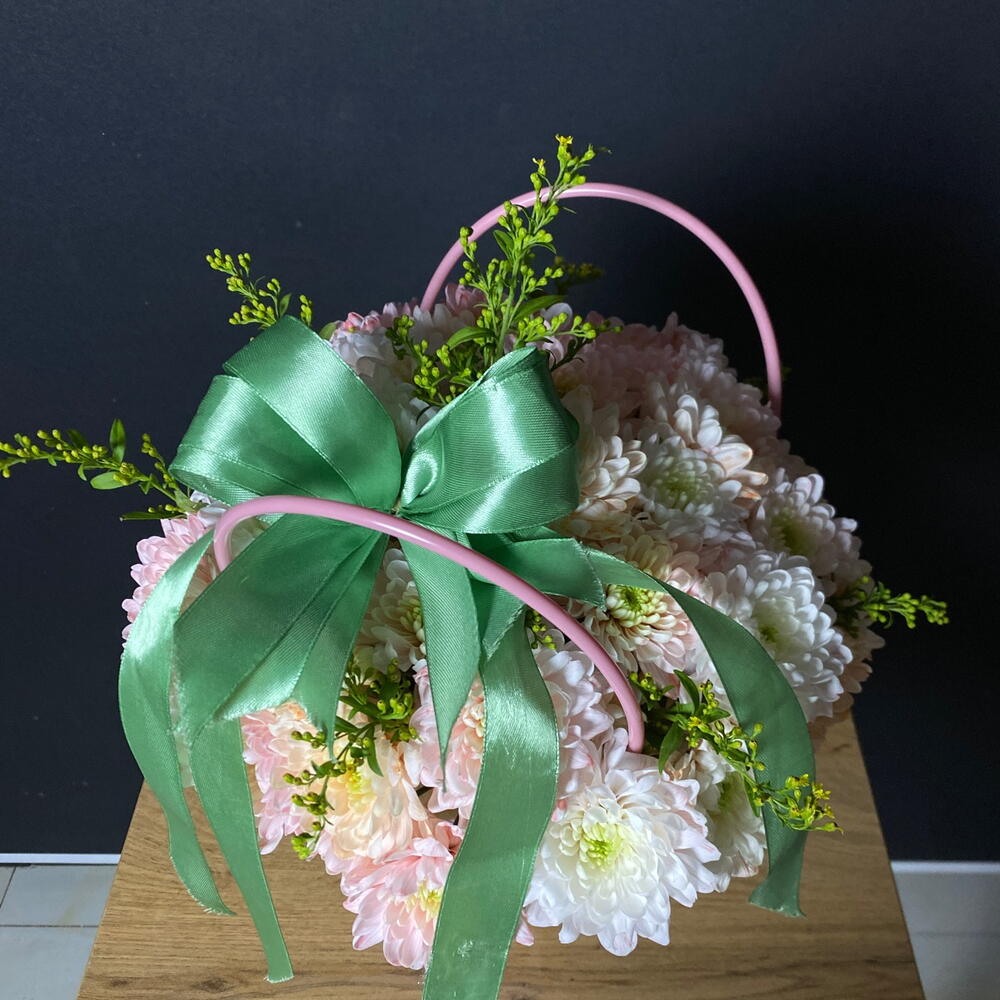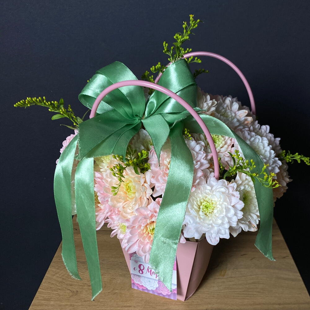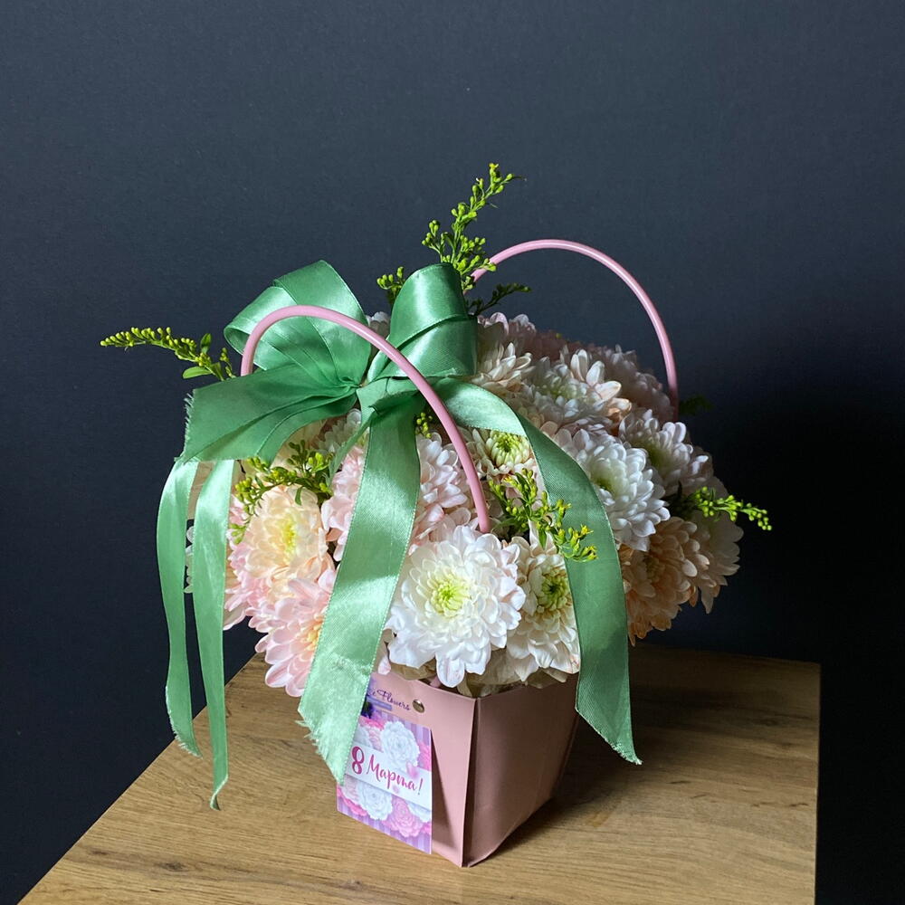 Солидаго - 1 шт. Хризантема кустовая - 3 шт. Лента атласная - 1 шт. Сумочка - 1 шт. Оазис флористический - 1 шт. открытка с вашими пожеланиями - 1 шт.