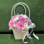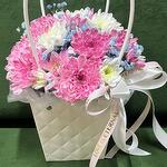 Нежная Сумочка с хризантемой и гипсофилой, стойкий состав, отличный комплект.