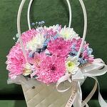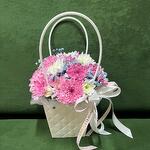 Гипсофила - 1 шт. Лента - 2 шт. Упаковка - 1 шт. Оазис флористический - 1 шт. хризантемы кустовые - 2 шт. сумочка с ручками из плотного картона ламинированного - 1 шт.