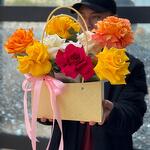 Роза желтая - 4 шт. Роза белая - 4 шт. Упаковка дизайнерская - 1 шт. Роза оранжевая - 2 шт. Оазис флористический - 1 шт. Эвкалипт Цинерея - 1 шт. роза ярко розовая - 1 шт. сумочка флористическая - 1 шт.