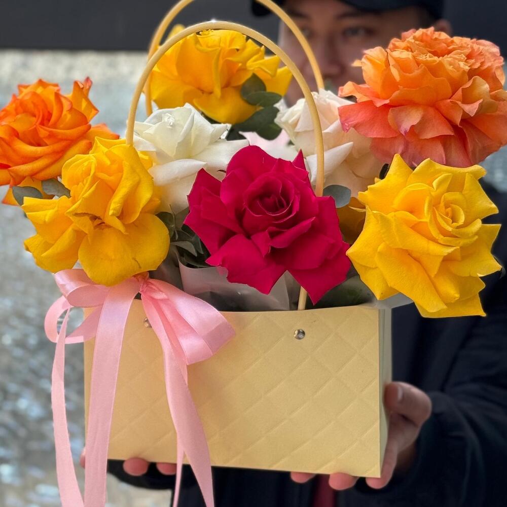 Роза желтая - 4 шт. Роза белая - 4 шт. Упаковка дизайнерская - 1 шт. Роза оранжевая - 2 шт. Оазис флористический - 1 шт. Эвкалипт Цинерея - 1 шт. роза ярко розовая - 1 шт. сумочка флористическая - 1 шт.