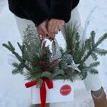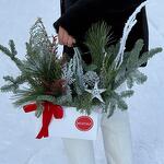 Упаковка дизайнерская - 2 шт. Оазис флористический - 1 шт. туя крашеная - 2 шт. нобилис s - 1 шт. сумочка с ручками из плотного картона ламинированного - 1 шт. туя зеленая - 1 шт. нобилис м - 1 шт. кипарис м - 1 шт. пинус s - 1 шт. серебро на шпажке - 2 шт. ветки заснеженые 60 см - 1 шт.