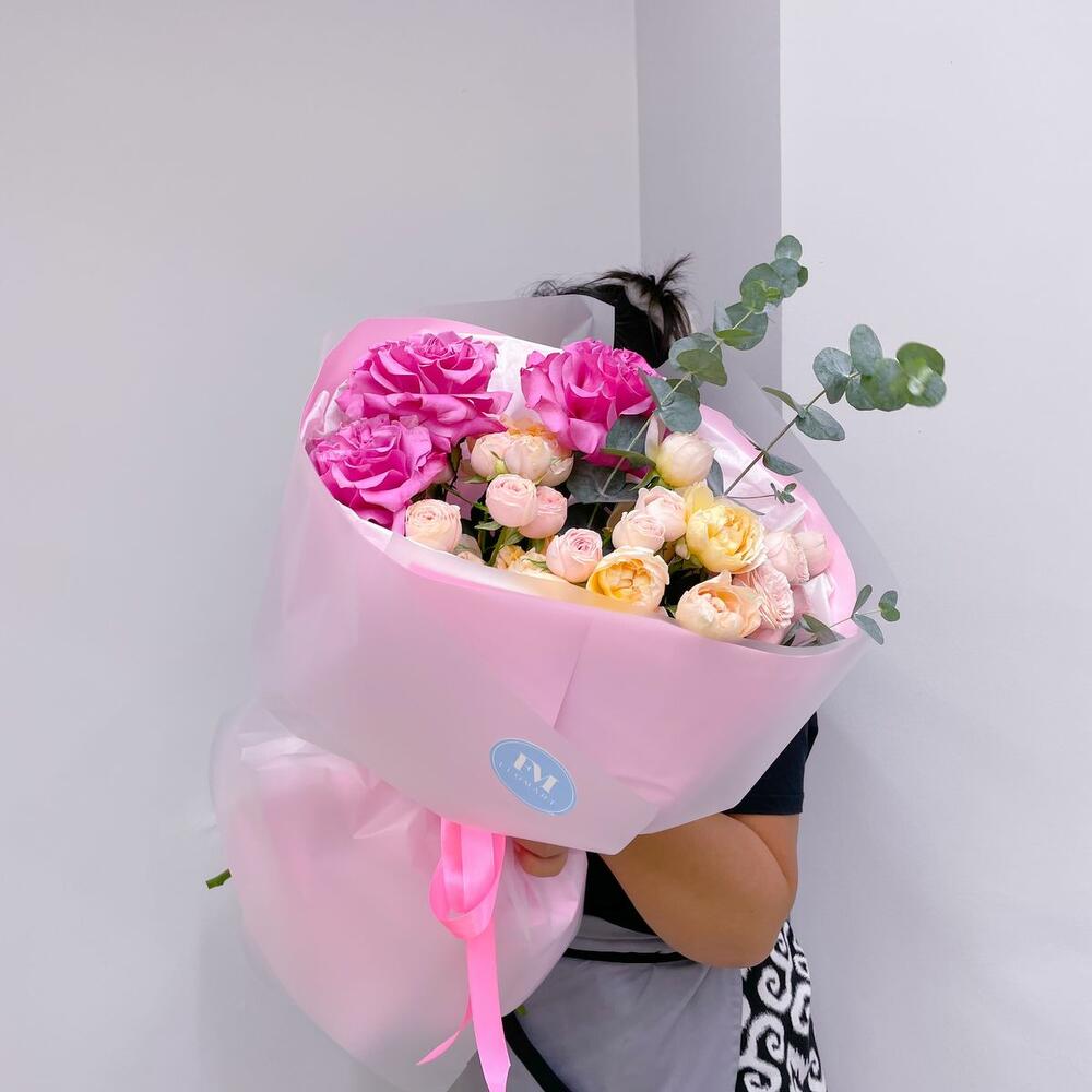 Роза кустовая - 5 шт. Эвкалипт - 1 шт. Роза пионовидная - 3 шт.