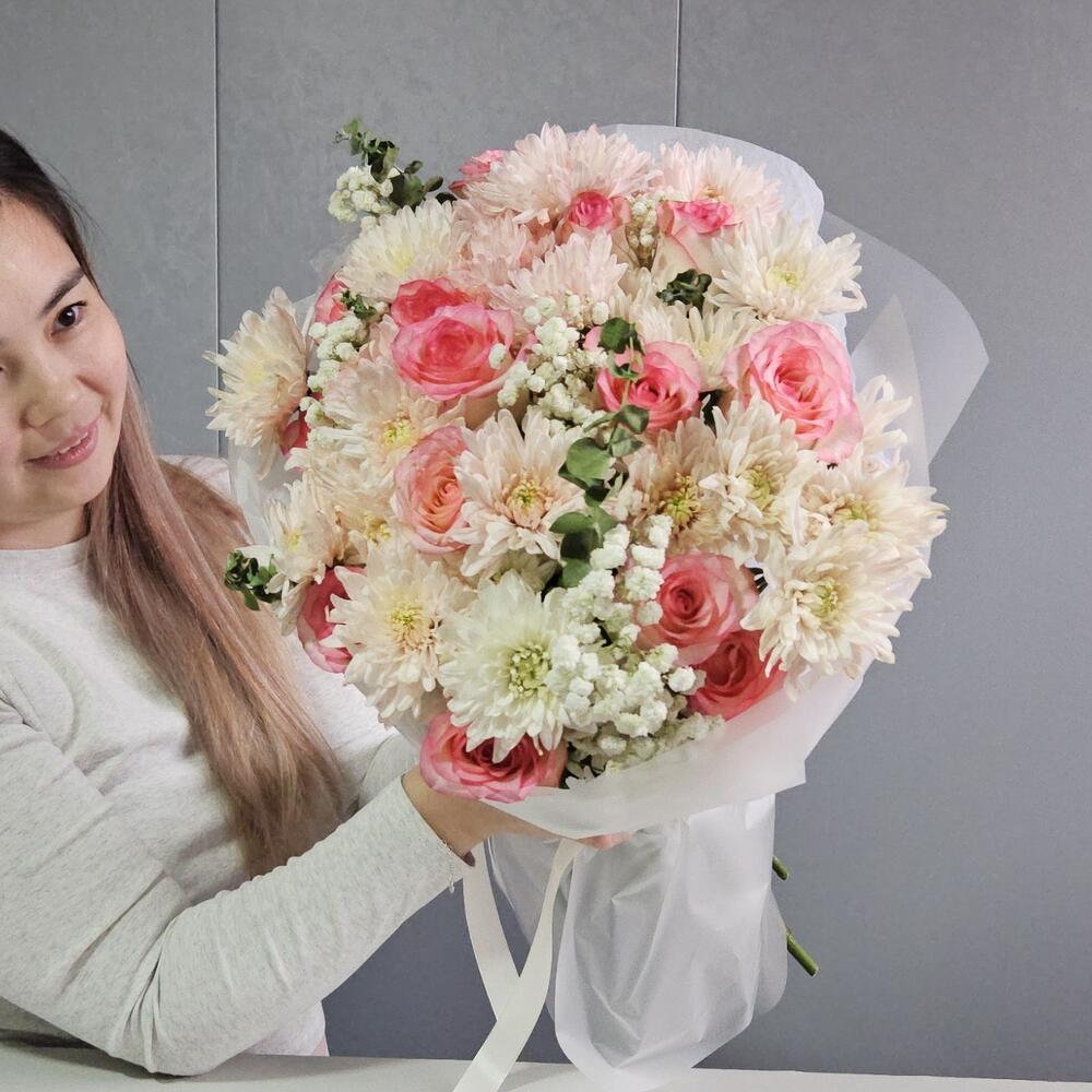 Гипсофила - 1 шт. Эвкалипт - 1 шт. Хризантема кустовая Розовая - 3 шт. розы - 13 шт.