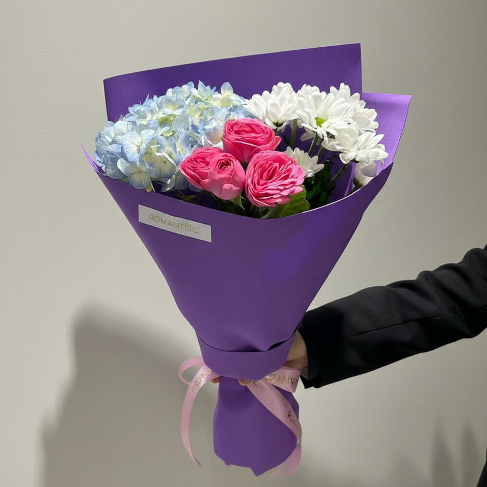 Этот букет - настоящее произведение искусства! Созданный талантливыми флористами, он состоит из изящной гортензии, пышной хризантемы кустовой и ароматной кустовой розы. Идеальный выбор для тех, кто ценит не только красоту, но и оригинальность. Каждый элемент букета подобран и скомбинирован так, чтобы подчеркнуть неповторимость и эстетичность композиции.