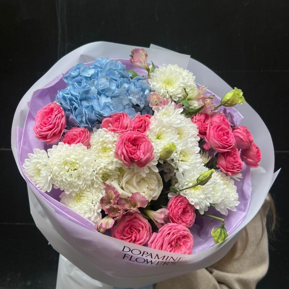 Гортензия - 1 шт. Хризантема кустовая - 3 шт. Эустома - 2 шт. кустовые розы - 4 шт.