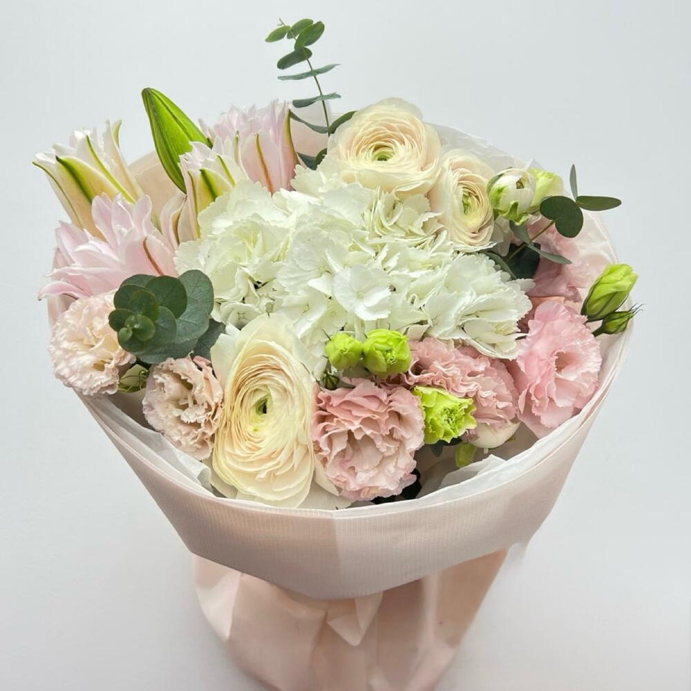 Гортензия - 1 шт. Лилия - 1 шт. Эвкалипт - 1 шт. Эустома - 2 шт. Ранункулус - 3 шт.