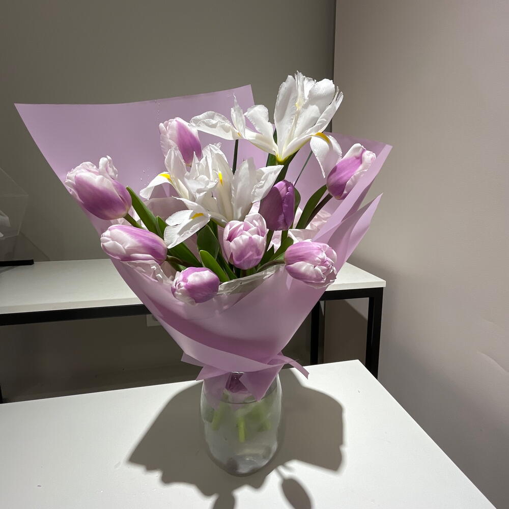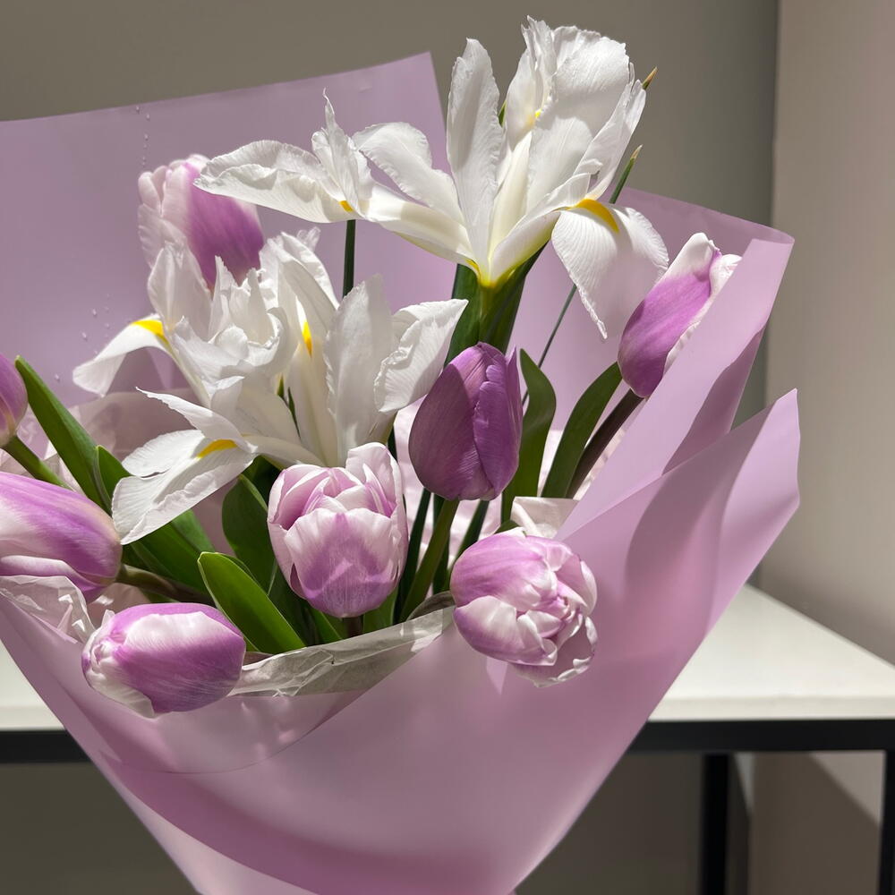 Ирис - 3 шт. Тюльпан - 9 шт. переноска для цветов - 1 шт.