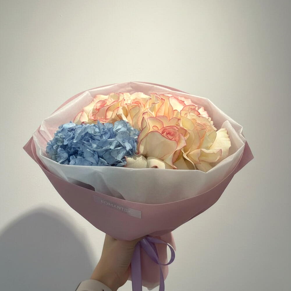 Этот нежный авторский букет станет идеальным подарком для самых прекрасных и незабываемых моментов жизни. Деликатная гортензия и пять ароматных роз, уложенные искусными руками флориста, смогут передать всю гамму чувств и эмоций. Подарите своим близким комбинацию изысканности и неповторимого очарования.