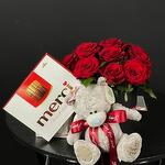 Мишка плюшевый - 1 шт. мерси конфеты - 1 шт. розы - 15 шт.