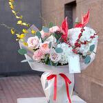 Антуриум - 2 шт. Гортензия - 2 шт. Илекс - 1 шт. Эвкалипт - 4 шт. Роза Эквадор - 3 шт. Диантус - 1 шт. Роза пионовидная - 1 шт. спрей джульетта - 1 шт. онцидиум - 1 шт.