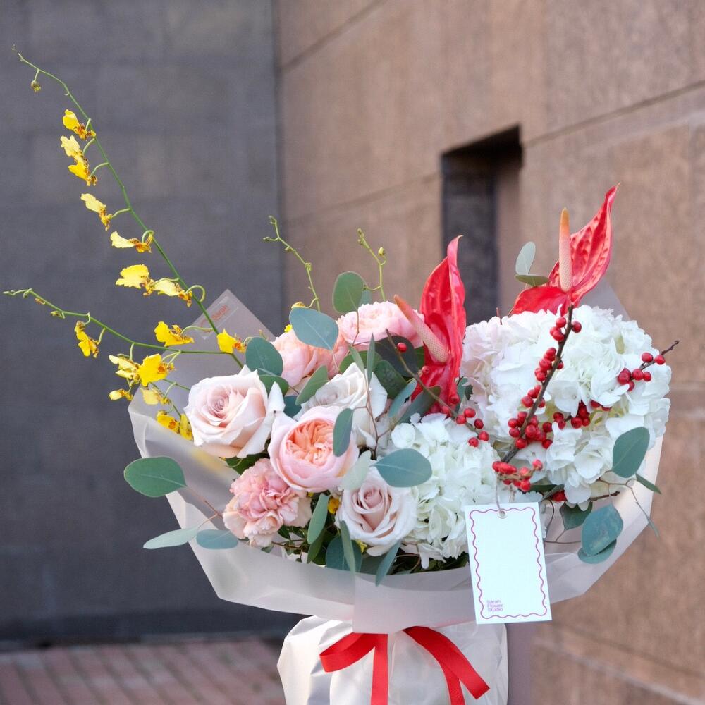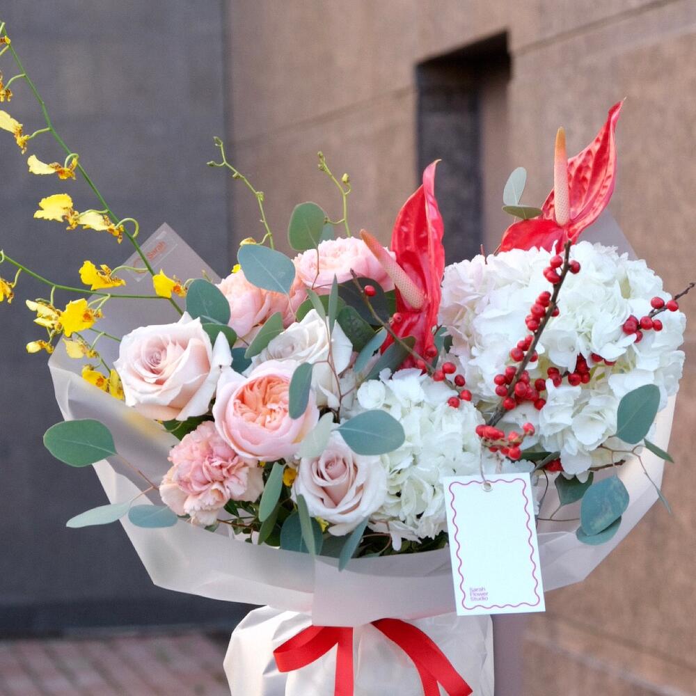 Антуриум - 2 шт. Гортензия - 2 шт. Илекс - 1 шт. Эвкалипт - 4 шт. Роза Эквадор - 3 шт. Диантус - 1 шт. Роза пионовидная - 1 шт. спрей джульетта - 1 шт. онцидиум - 1 шт.