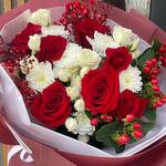 Ваксфлауэр - 3 шт. Гиперикум - 1 шт. Хризантема кустовая - 2 шт. Роза - 7 шт. Кустовая роза - 4 шт.