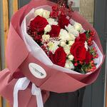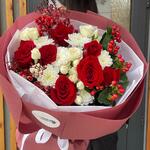 Этот авторский букет станет идеальным выбором для ценителей утонченной классики. В его состав входит трехцветный ваксфлауэр, добавляющий букету неповторимого шарма, одинаково великолепного гиперикума и две нежные кустовые хризантемы. Главное украшение - семь ароматных роз и четыре кустовые розы, придающие букету королевскую изысканность. Этот букет будет стоящим подчеркиванием вашего особого отношения и вкуса.
