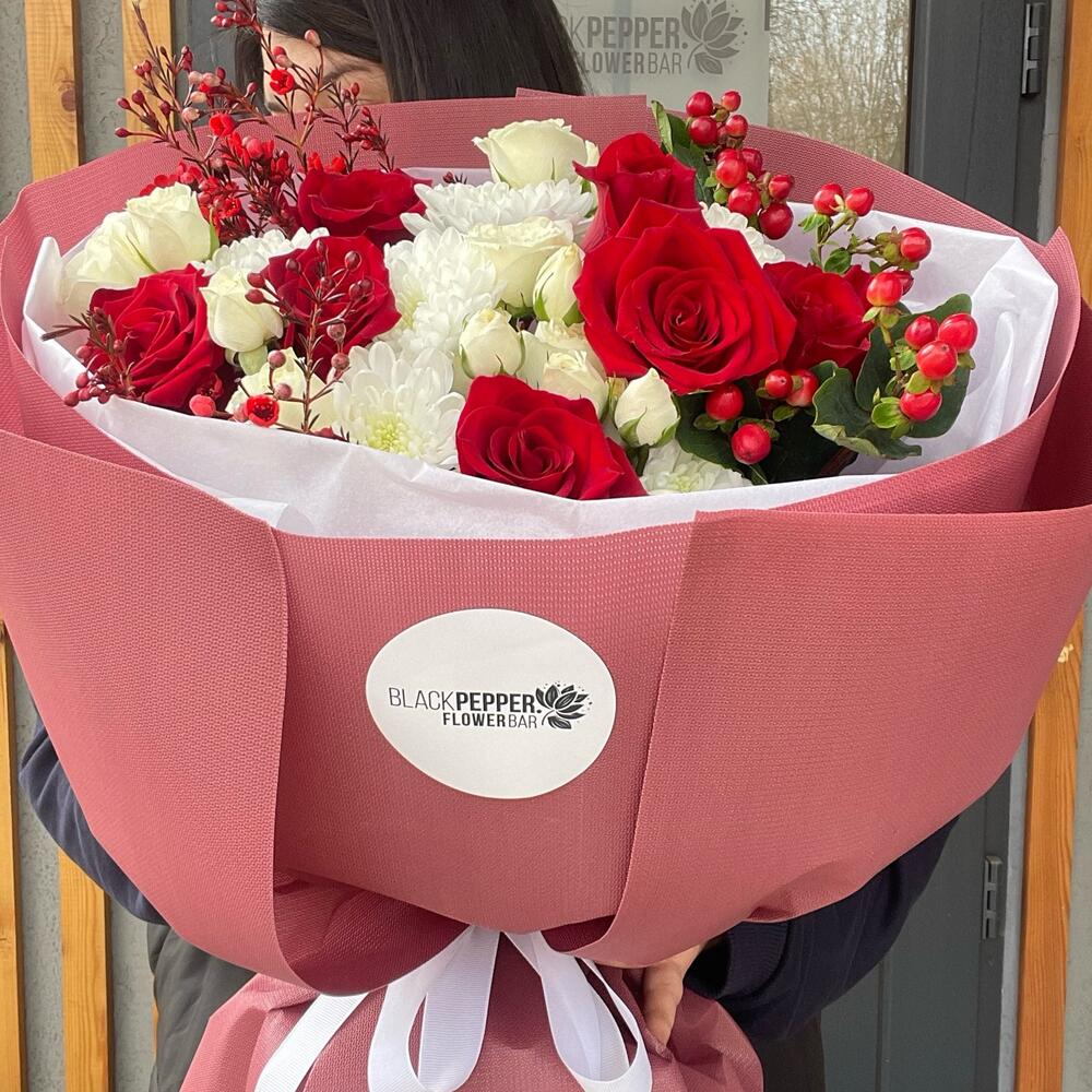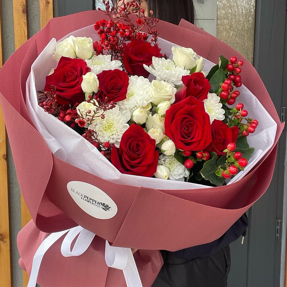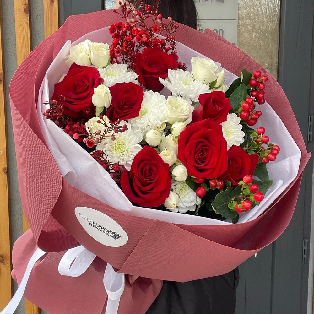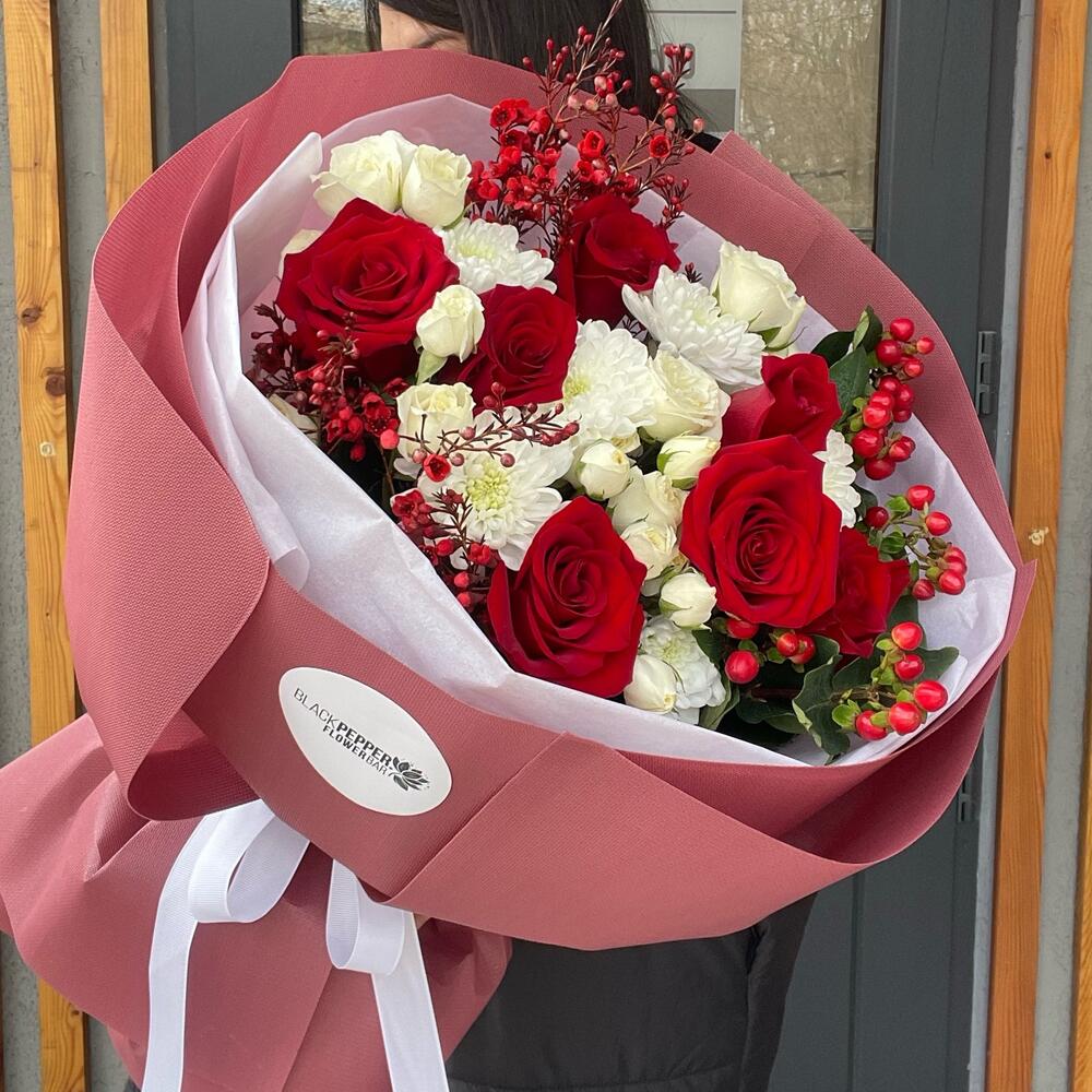 Этот авторский букет станет идеальным выбором для ценителей утонченной классики. В его состав входит трехцветный ваксфлауэр, добавляющий букету неповторимого шарма, одинаково великолепного гиперикума и две нежные кустовые хризантемы. Главное украшение - семь ароматных роз и четыре кустовые розы, придающие букету королевскую изысканность. Этот букет будет стоящим подчеркиванием вашего особого отношения и вкуса.