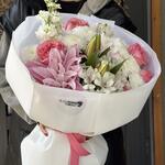 Этот авторский букет представляет собой истинное произведение искусства. Он гармонично сочетает в себе разнообразие цветов: три нежные альстромерии, одну изящную лилию, утонченную маттиолу, три пышные кустовые хризантемы и пять роскошных роз. Это цветочная композиция, способная украсить любое событие и подчеркнуть ваш изысканный вкус.