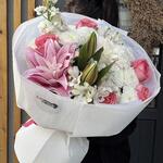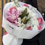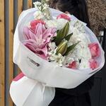 Альстромерия - 3 шт. Лилия - 1 шт. Маттиола - 1 шт. Хризантема кустовая - 3 шт. Роза - 5 шт.