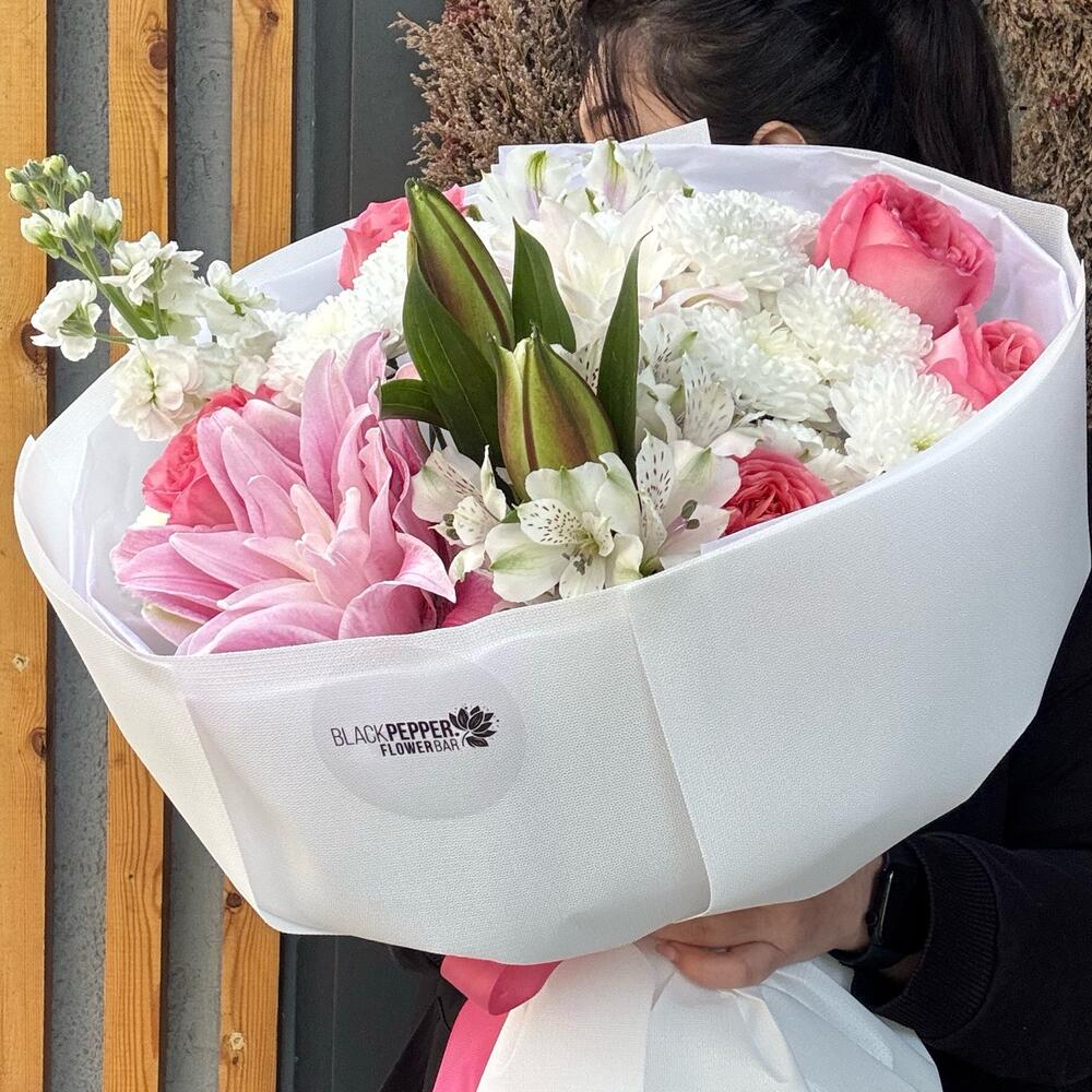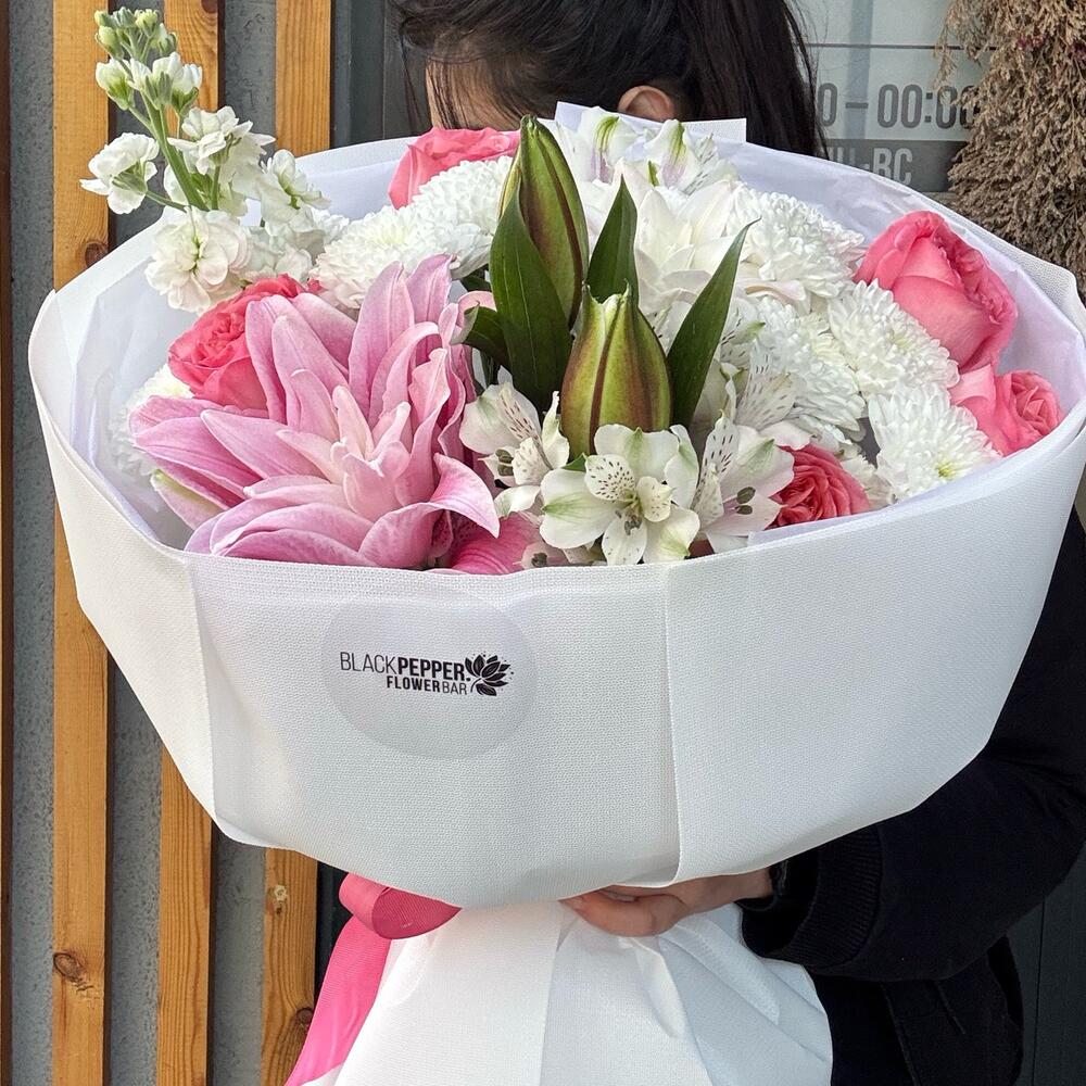 Альстромерия - 3 шт. Лилия - 1 шт. Маттиола - 1 шт. Хризантема кустовая - 3 шт. Роза - 5 шт.