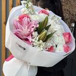 Альстромерия - 3 шт. Лилия - 1 шт. Маттиола - 1 шт. Хризантема кустовая - 3 шт. Роза - 5 шт.