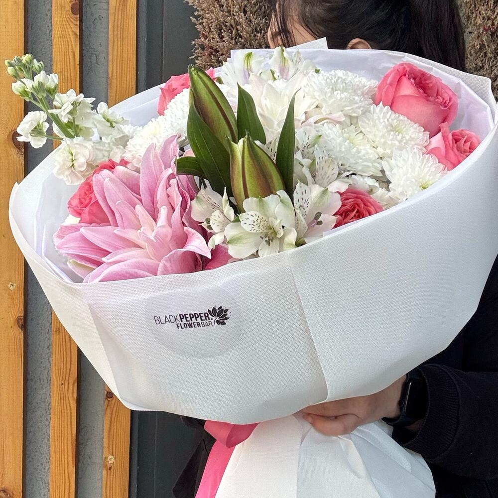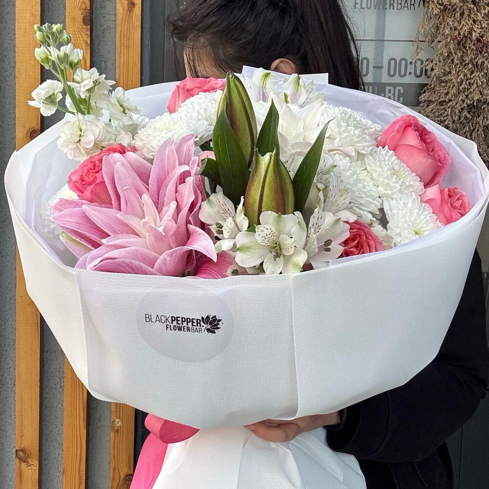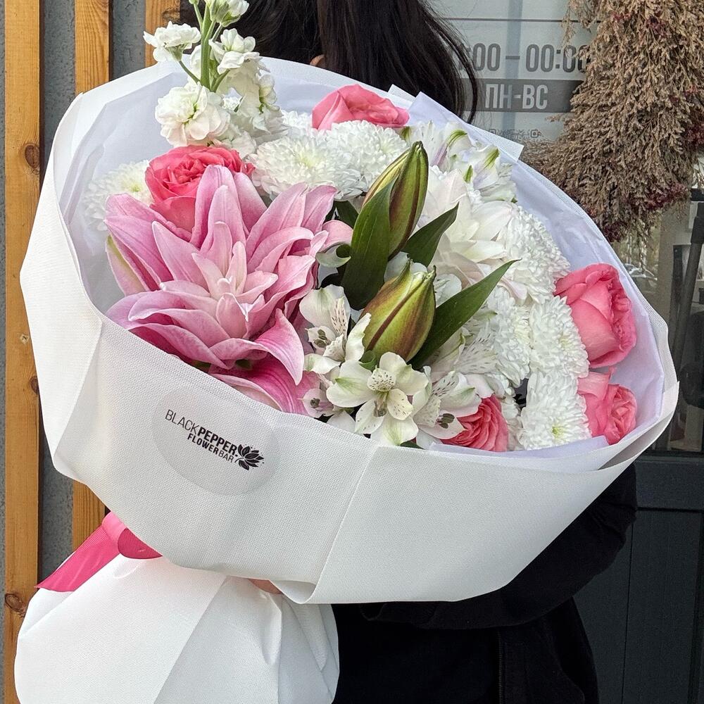 Альстромерия - 3 шт. Лилия - 1 шт. Маттиола - 1 шт. Хризантема кустовая - 3 шт. Роза - 5 шт.