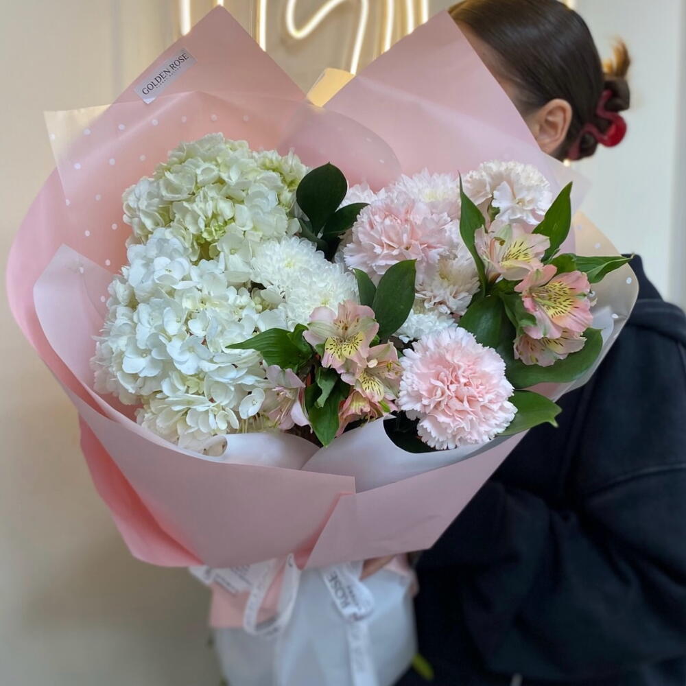 Альстромерия - 2 шт. Рускус - 1 шт. Хризантема кустовая - 2 шт. Диантус - 3 шт. Гортензия Премиум Микс - 1 шт.