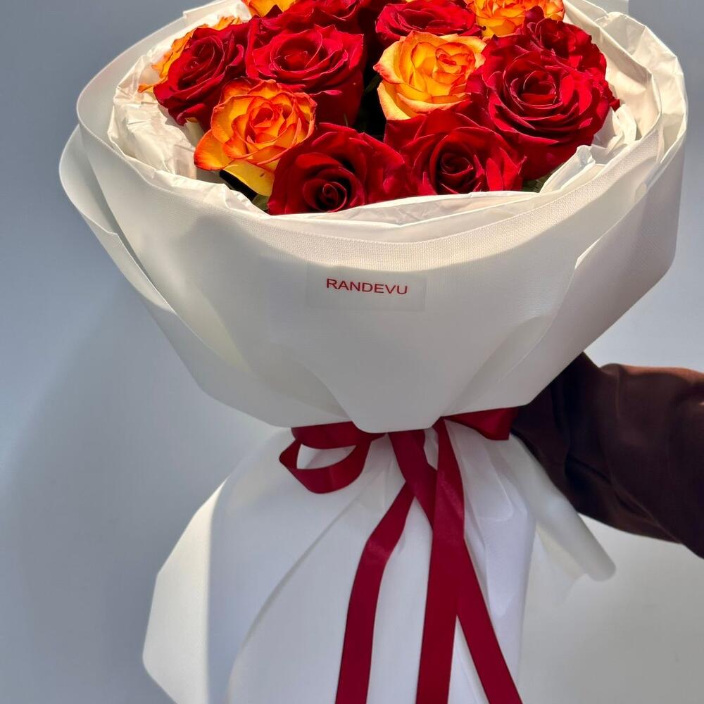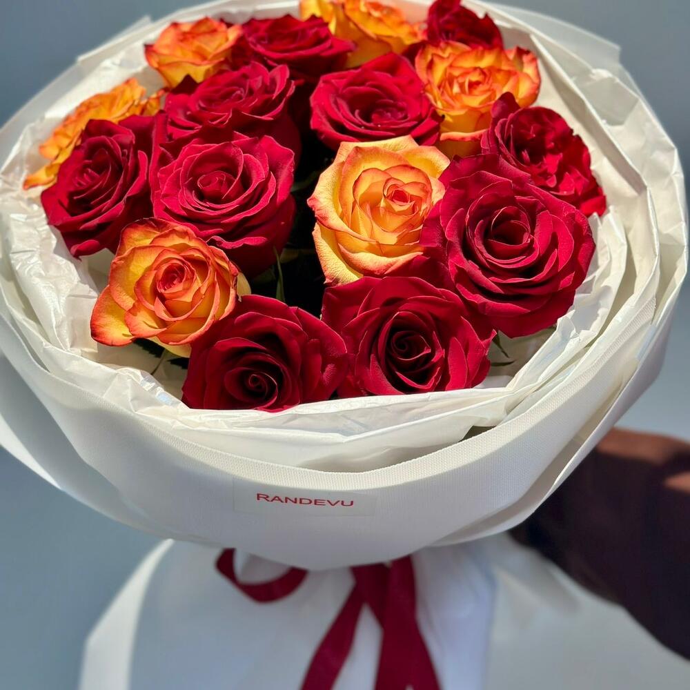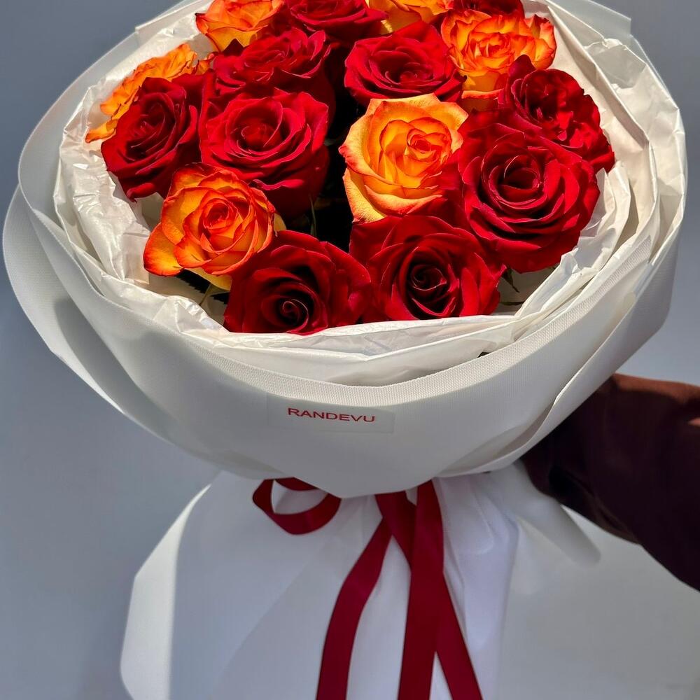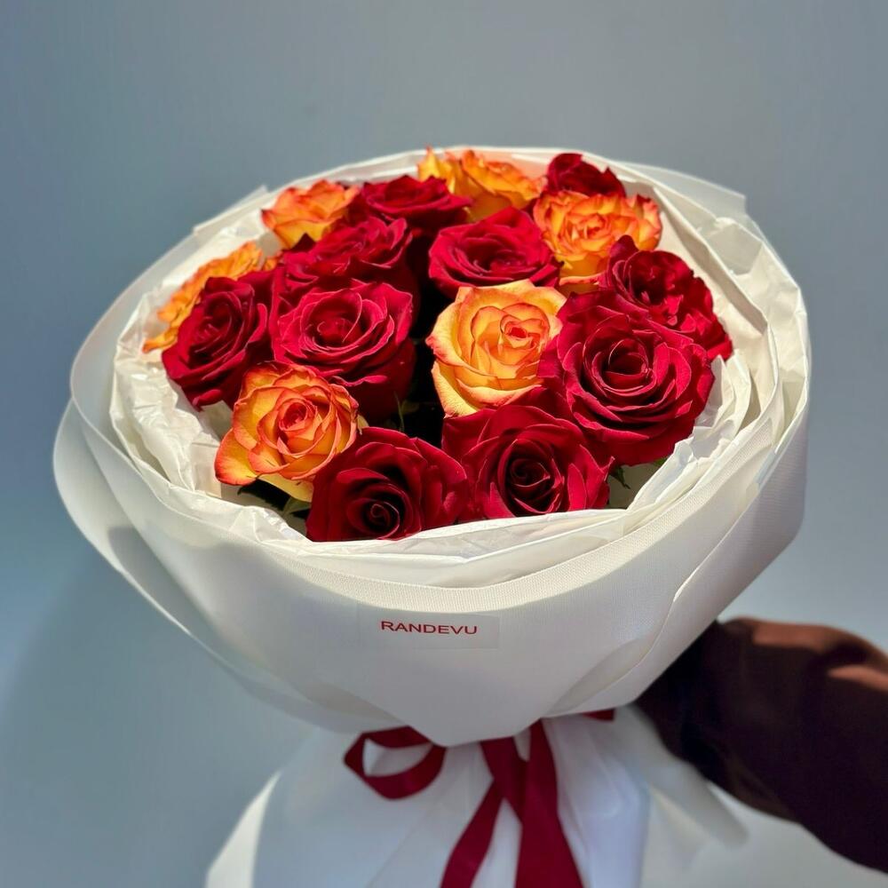 Комбинация роз, красного и оранжевого цвета создают теплую и уютную атмосферу