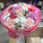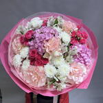 Гортензия розовая - 2 шт. Роза французская розовая - 5 шт. Хризантема кустовая Алтай - 4 шт. Роза кустовая Софи - 4 шт. альстромерия белая - 4 шт.