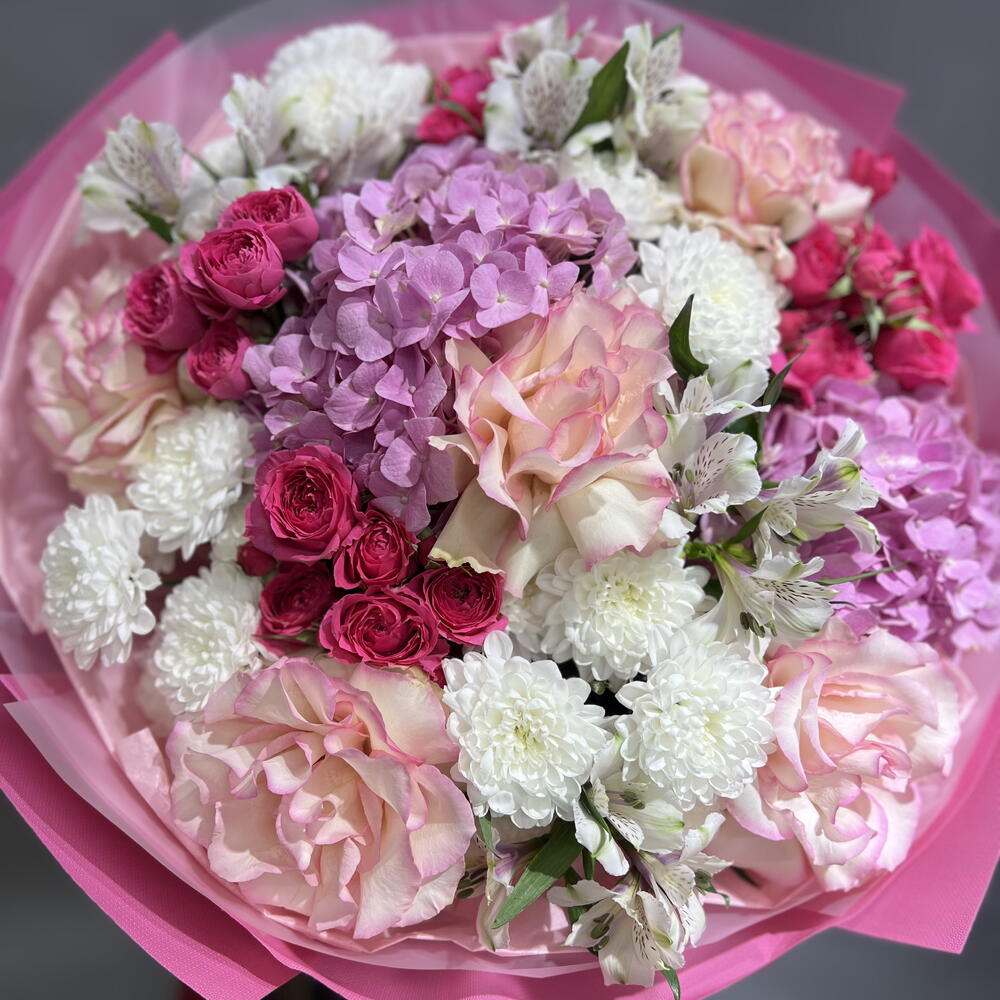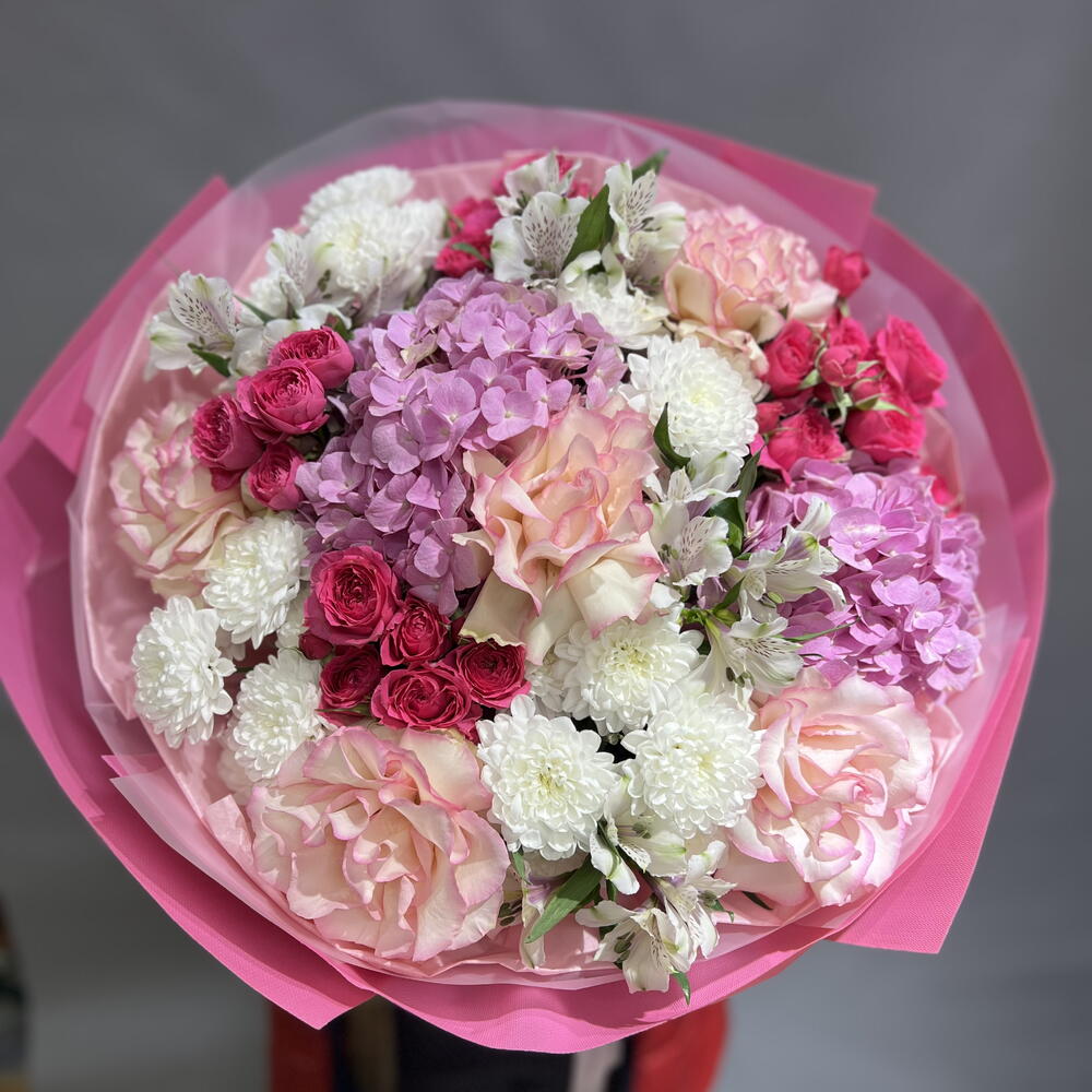 Гортензия розовая - 2 шт. Роза французская розовая - 5 шт. Хризантема кустовая Алтай - 4 шт. Роза кустовая Софи - 4 шт. альстромерия белая - 4 шт.