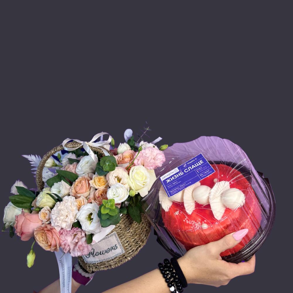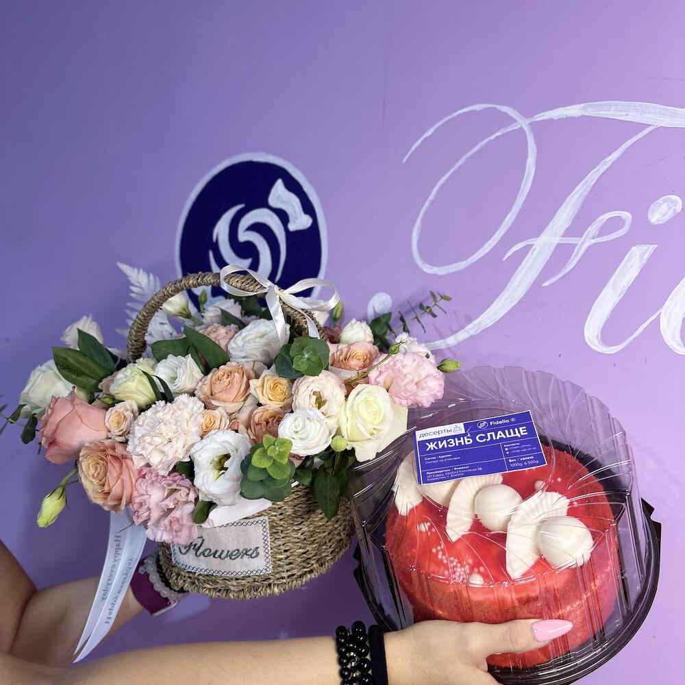 Торт и корзина роз