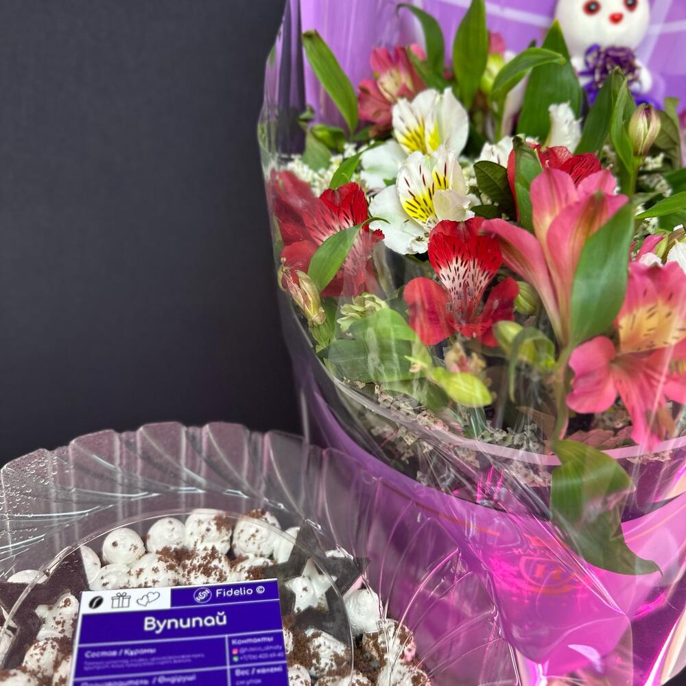 Мы создали для вас идеальное сочетание из сладкого и прекрасного! Встречайте наш новый комбо-набор: нежнейший торт Вупипай и изысканный букет в корзине, состоящий из Альстремерий, ромашек и зелени. Этот дуэт станет отличным подарком для самых важных моментов в жизни. Закажите прямо сейчас и порадуйте своих близких! Уточняем, что букет может немного меняться от тех, что на фото. В случае нюансов, наша команда обязательно с вами свяжется❤️