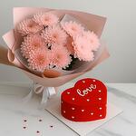 Романтичный красный торт в форме сердца с надписью love, украшенный мелкими сердечками. Идеальный дуэт с нежным букетом розовых хризантем. бисквит, сливочный крем, натуральное пищевое окрашивание, сахар, мука, яйца, масло. КБЖУ (100 г): • Калории: ~320 ккал • Белки: 5 г • Жиры: 18 г • Углеводы: 35 г