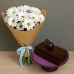 Изысканный торт с насыщенным шоколадным вкусом в дуэте с нежным букетом белых хризантем — подарок, который передаст самые тёплые чувства. Состав торта: Бисквит на какао, прослойка шоколадного ганаша, крем на основе сливочного масла и сливок, натуральный чёрный шоколад. КБЖУ (на 100 г): Калорийность: ~ 380 ккал Белки: 5 г Жиры: 22 г Углеводы: 40 г