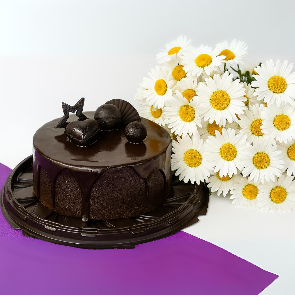 Подарочный дуэт — шоколадный торт Блисс и букет свежих ромашек — идеальное сочетание для тех, кто хочет порадовать с изысканным вкусом и нежностью. Торт Блисс — насыщенный шоколадный десерт с тройным бисквитом, покрытый блестящей глазурью и украшенный фигурным декором из бельгийского шоколада. Внутри — бархатный шоколадный крем, тающий во рту. Букет ромашек — собран вручную, оформлен в крафт-упаковку с лентой. Лёгкий, ароматный, с настроением тёплого летнего утра. Подходит для: — признания в любви — благодарности — дня рождения или без повода КБЖУ (на 100 г торта): Калории: ~390 ккал Белки: 5 г Жиры: 21 г Углеводы: 45 г Десерт и цветы можно приобрести вместе или по отдельности. Возможна открытка с индивидуальным посланием.