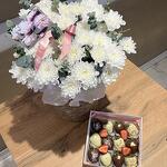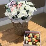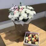 Трендовая корзина из хризантем и сладкая клубника в бельгийском шоколаде, очень стильный подарок для близкого. Букеты и клубника в шоколаде собираются только в день заказа, только свежие цветы и сладости