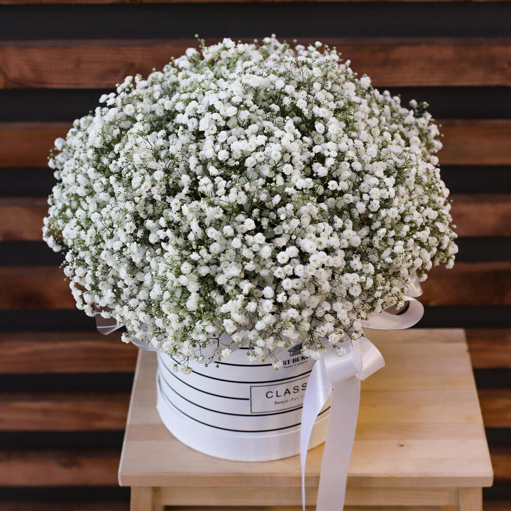 Гипсофила - 10 шт. Лента - 1 шт. Коробка - 1 шт. Пиафлор - 1 шт.