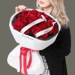 Голландские розы насыщенного алого цвета — символ горячих чувств. Роскошный подарок в стильной белой упаковке для самой важной женщины.