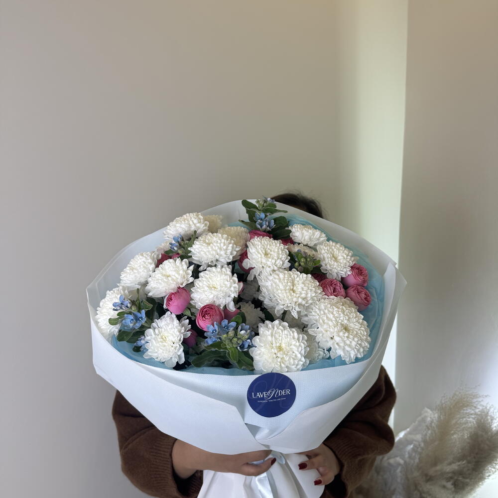 Роза пионовидная кустовая - 4 шт. Твидия - 5 шт. хризантема алтай - 5 шт.