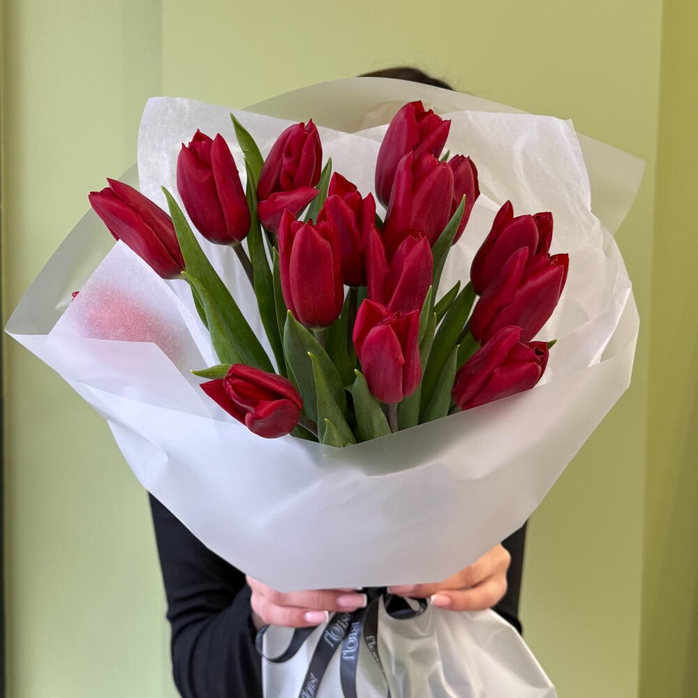 Тюльпан - 15 шт. Упаковка дизайнерская - 2 шт. Открыточка с вашими пожеланиями - 1 шт.