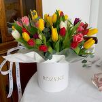 Тюльпан - 37 шт. Эвкалипт - 2 шт. Коробка шляпная - 1 шт. Упаковка дизайнерская - 2 шт. Оазис флористический - 1 шт.