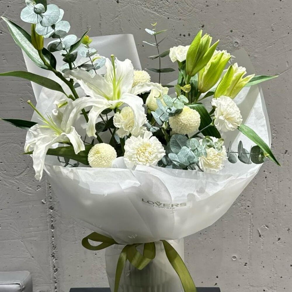 Лилия - 2 шт. Гвоздика - 5 шт. Эвкалипт Цинерея - 2 шт. момоко хризантема - 3 шт.