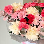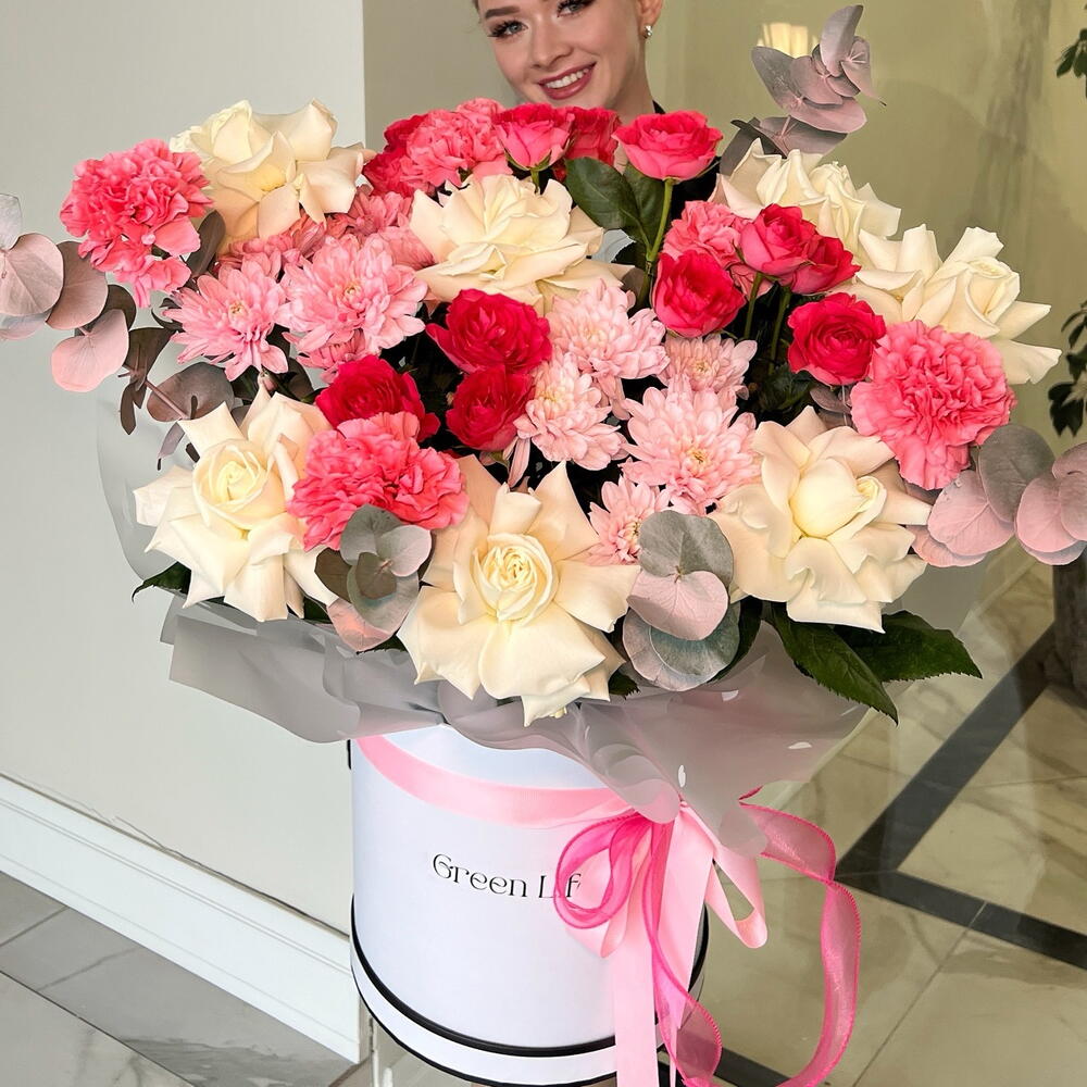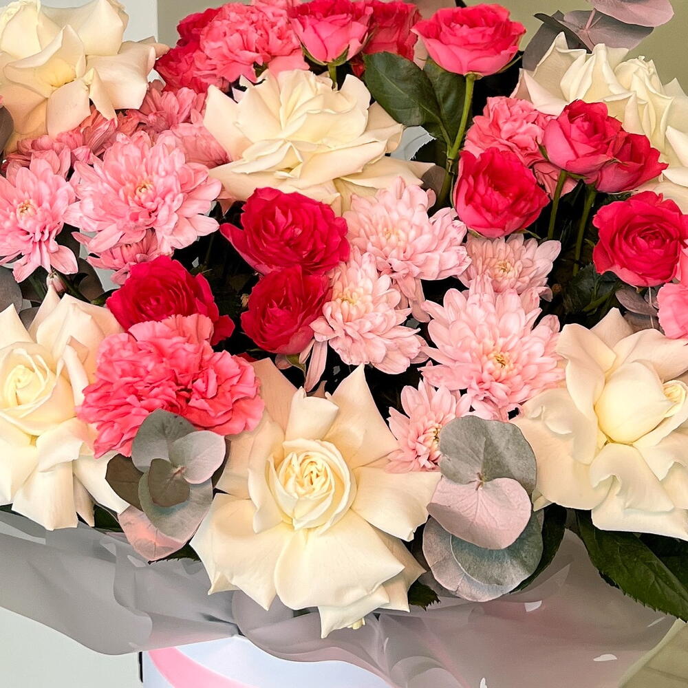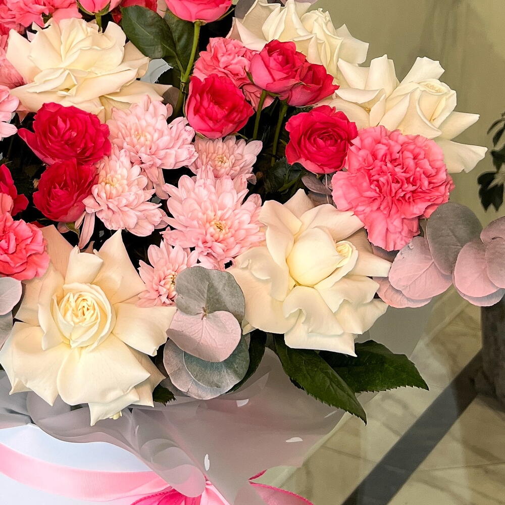 Хризантема кустовая - 2 шт. Эвкалипт - 1 шт. Роза - 7 шт. Кустовая роза - 3 шт. Диантус - 5 шт. Коробка шляпная - 1 шт.