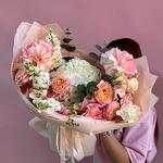 Роскошный и многослойный букет в нежных кремово-розовых оттенках, сочетающий в себе изысканные сорта роз, пионовидные цветы, эустому и белоснежную гортензию. Дополнен эвкалиптом и оформлен в элегантную матовую упаковку с атласной лентой.