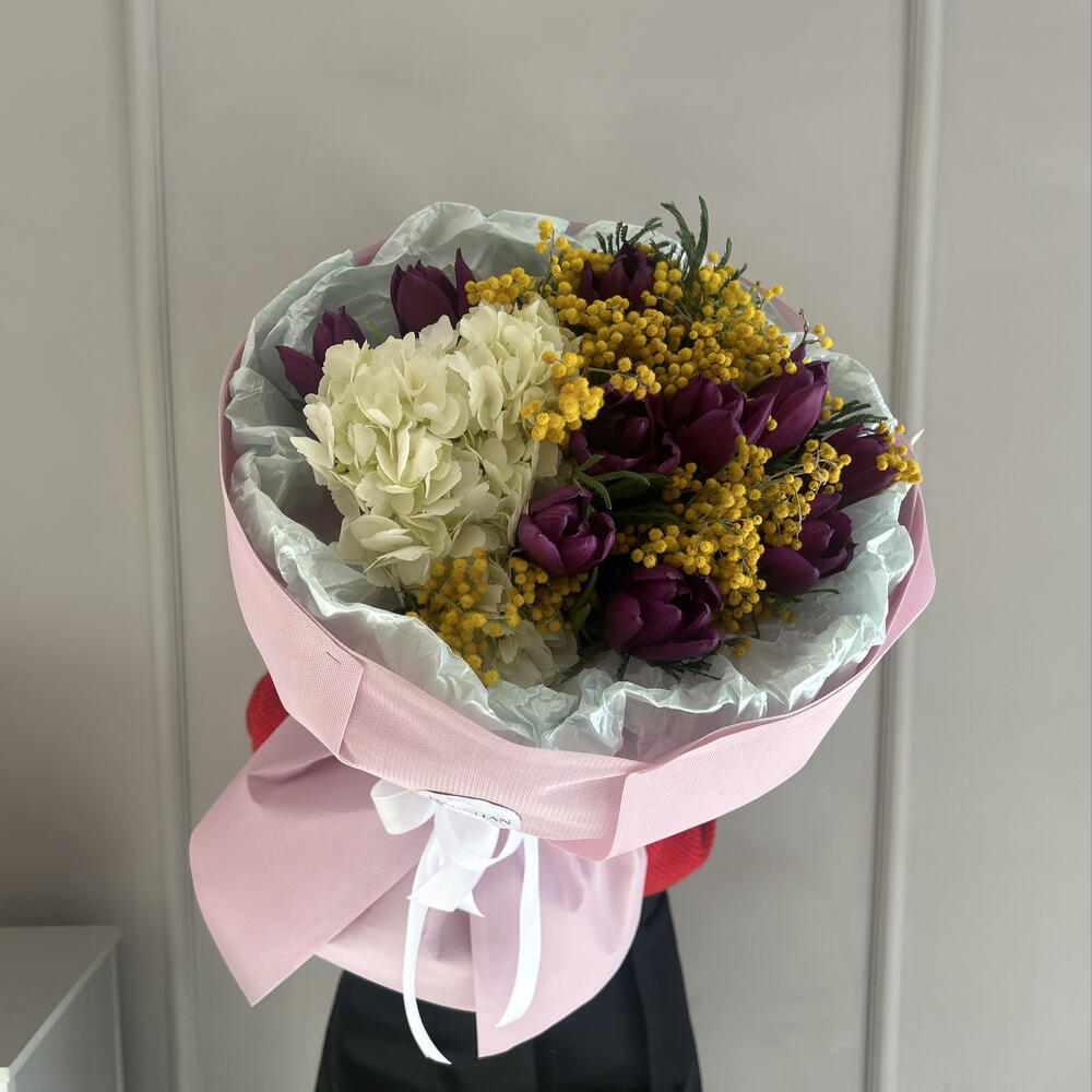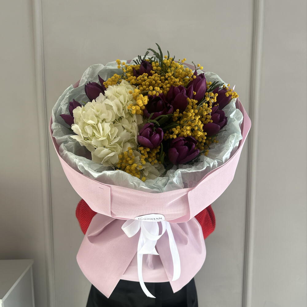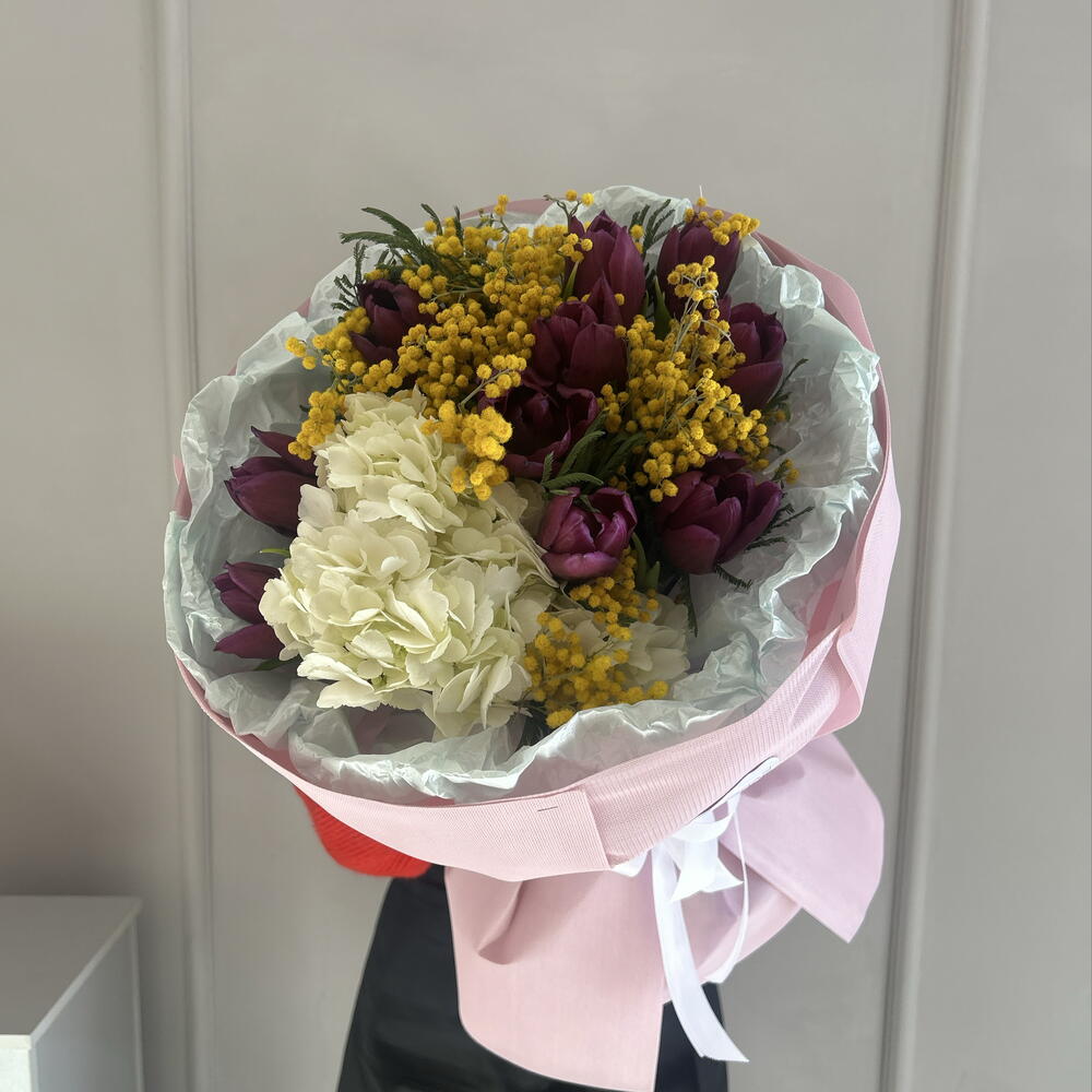 Гортензия - 1 шт. Мимоза - 4 шт. Тюльпан - 9 шт.