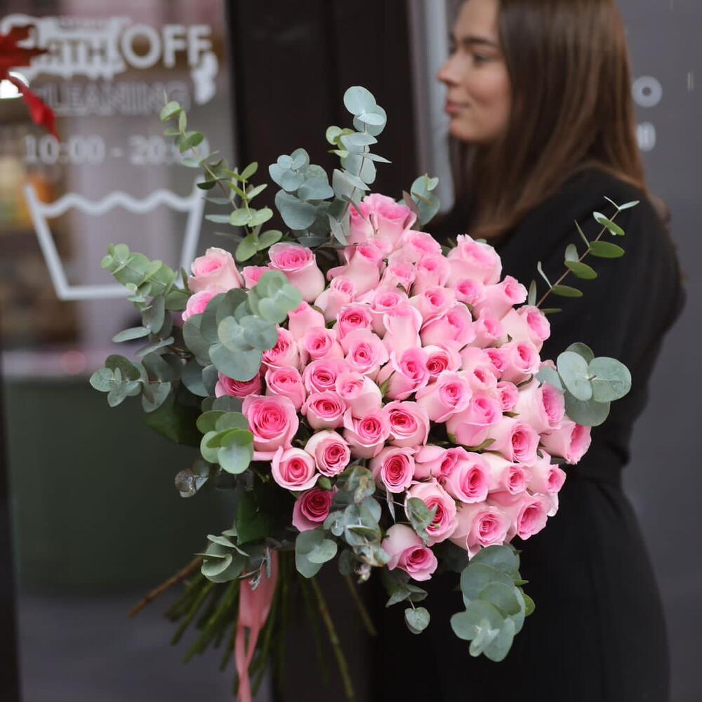 Вау букет из 51 розовой розы и эвкалипта
