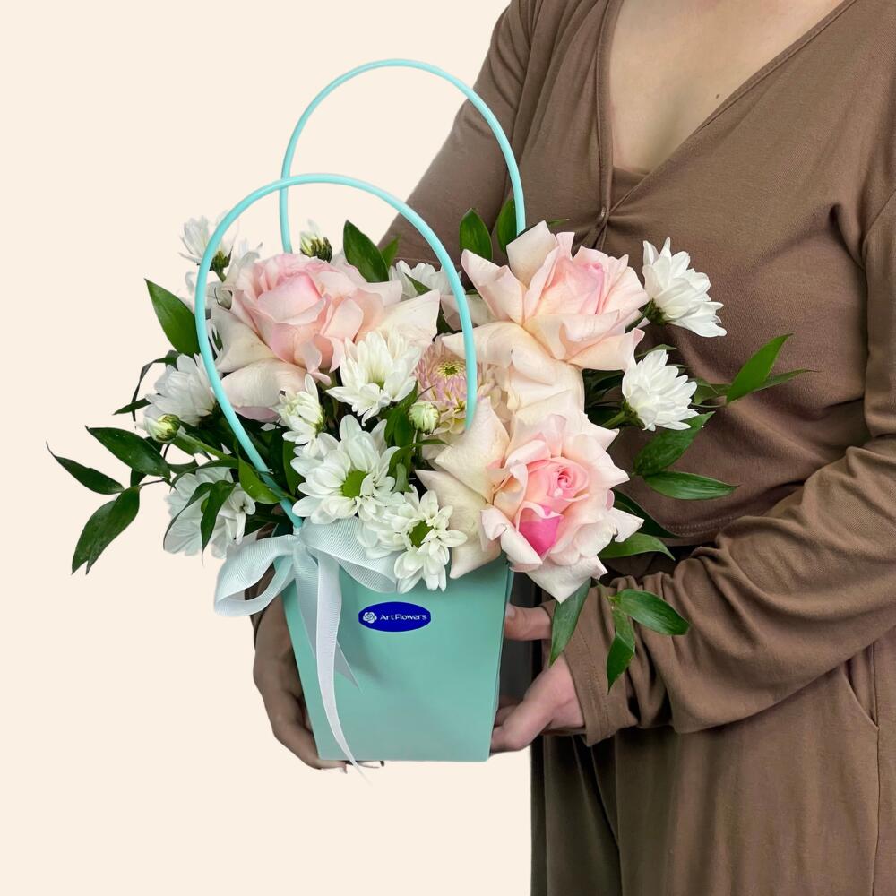 Рускус - 1 шт. Роза - 3 шт. Хризантема - 1 шт. Сумка - 1 шт.