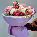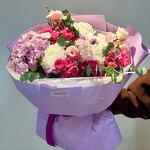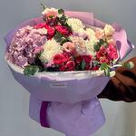 Гортензия - 1 шт. Роза кустовая - 5 шт. Эвкалипт - 1 шт. Тишью - 3 шт. бумага дизайнерская - 3 шт. хризантемы кустовые - 1 шт. эустомы - 3 шт. хризантемы на - 3 шт.