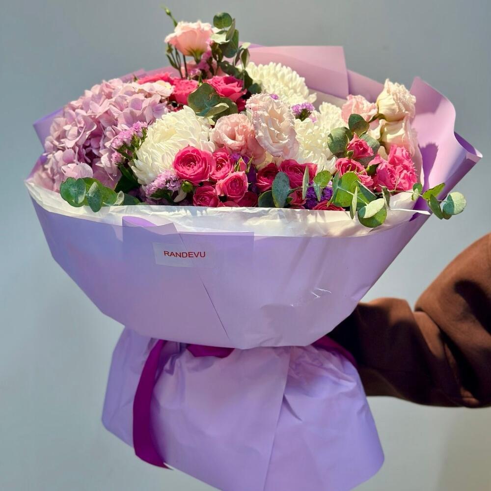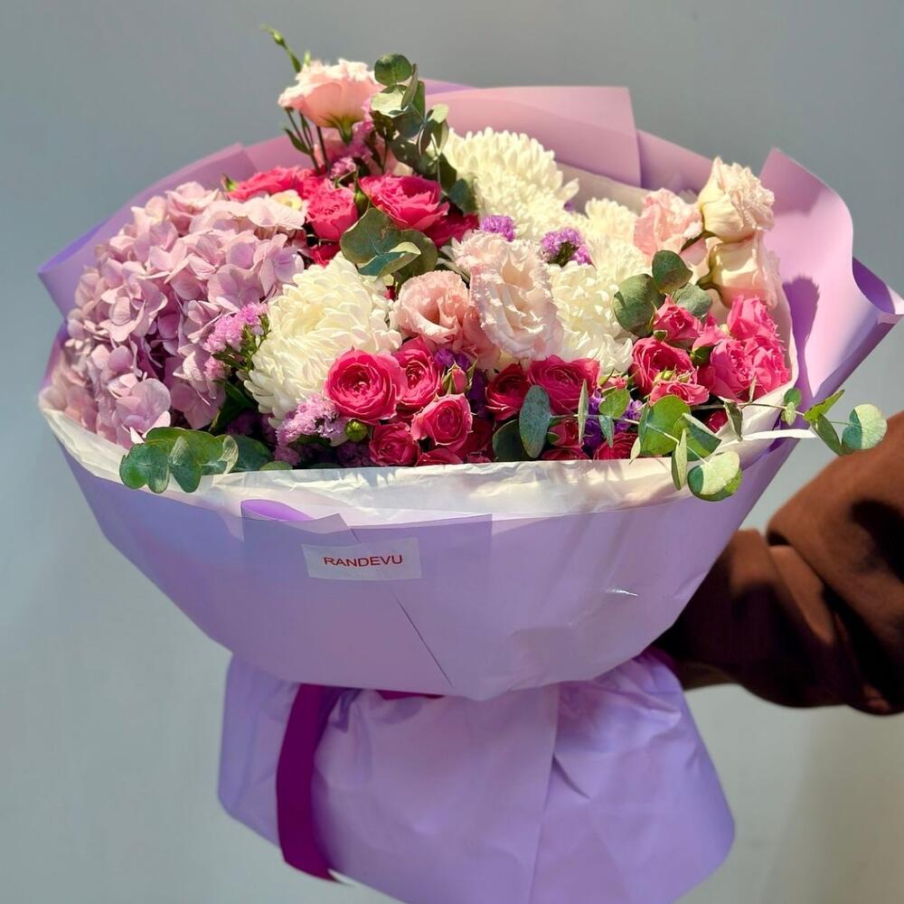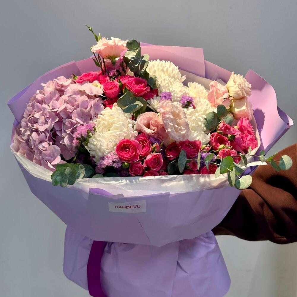 Гортензия - 1 шт. Роза кустовая - 5 шт. Эвкалипт - 1 шт. Тишью - 3 шт. бумага дизайнерская - 3 шт. хризантемы кустовые - 1 шт. эустомы - 3 шт. хризантемы на - 3 шт.